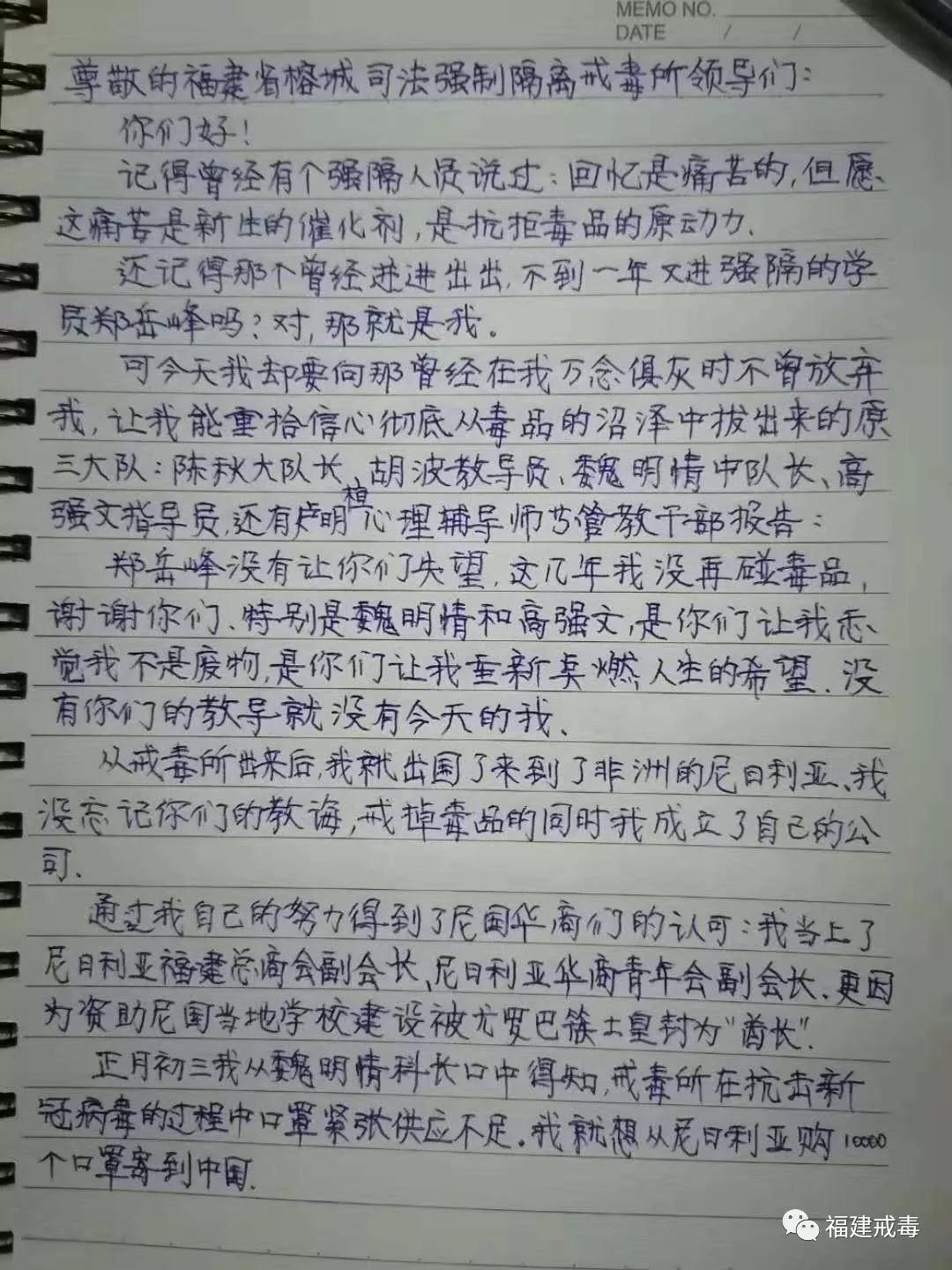 與口罩一起寄到的,還有兩張鄭嶽峯親筆寫的感謝信,在信中這位曾經的戒毒所學員寫道,戒毒所的經歷,讓他重拾信心,重新點燃了人生的希望,還在非洲成立了自己的公司,通過努力得到了尼日利亞華商們的認可,不僅當上了尼日利亞福建總商會副會長,還因為資助尼日利亞當地學校建設被尤羅巴族土皇封為“酋長”。