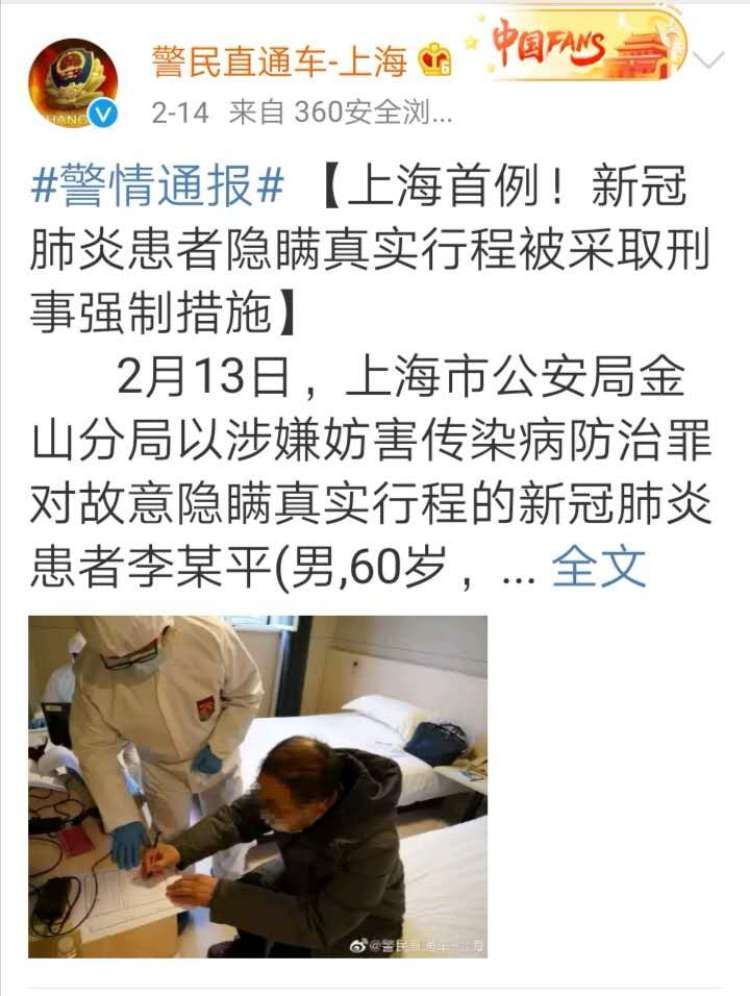 2月13日,上海市公安局金山分局以涉嫌妨害傳染病防治罪,對故意隱瞞真實行程的新冠肺炎患者李某(男,60歲,現住上海市金山區,已治癒出院)採取刑事強制措施。這是此次疫情以來,上海第一起以涉嫌妨害傳染病防治罪採取刑事強制措施的案件。