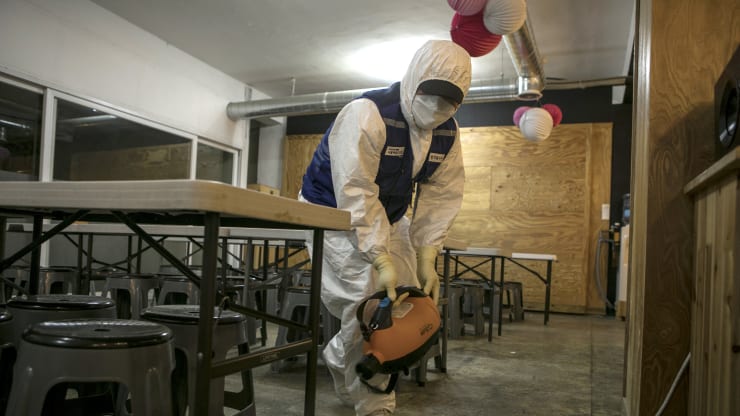 2月7日,清潔工人在首爾一家餐廳消毒 圖源:CNBC