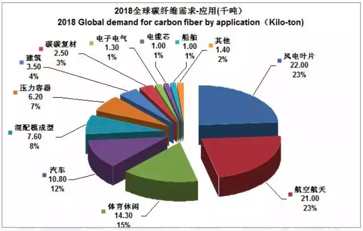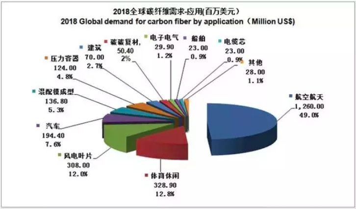 在具體商用方面,《2018全球碳纖維複合材料市場報告》統計的數據顯示,2018年,全球碳纖維的銷售金額為25.71億美元,比2017年23.44億美元增長了9.7%。其中,航空航天以12.6億美元佔比接近一半。第二至五位依次是體育休閒、風電葉片、汽車和混配模成型需求應用。