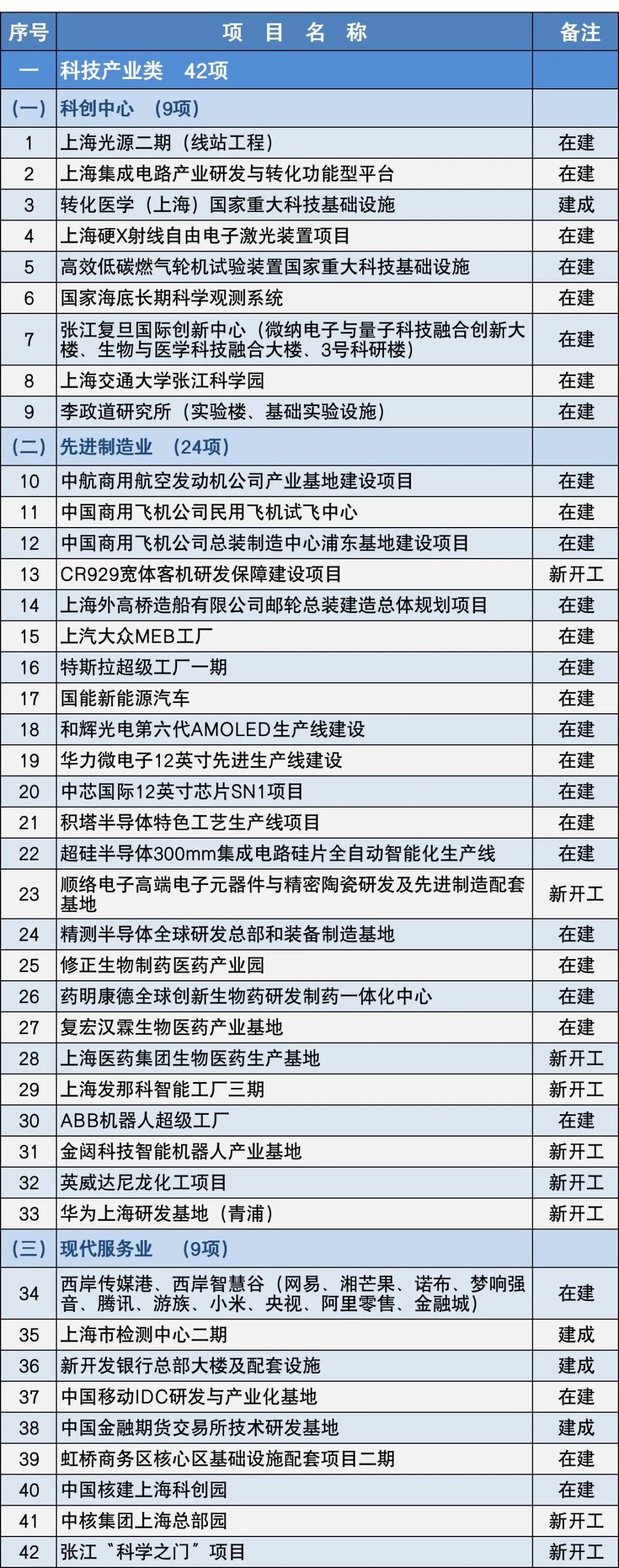 其中科技產業類計劃新開工項目9項,包括CR929寬體客機研發保障建設項目、英威達尼龍化工項目、中核集團上海總部園、華為上海研發基地(青浦)、張江“科學之門”項目等。