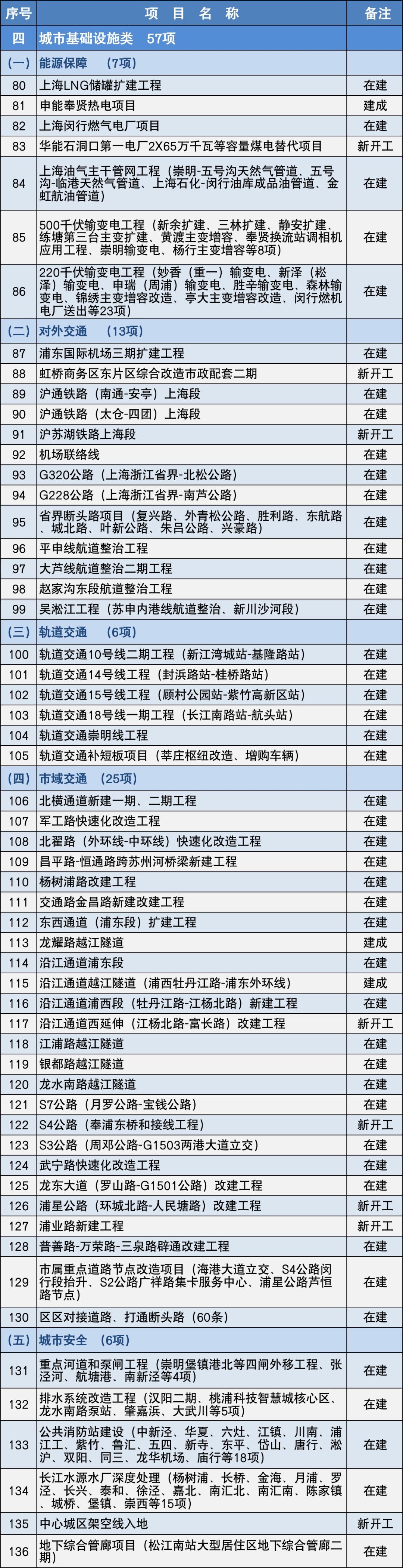 計劃新開工項目8項,分別為華能石洞口第一電廠2X65萬千瓦等容量煤電替代項目、虹橋商務區東片區綜合改造市政配套二期、滬蘇湖鐵路上海段、沿江通道西延伸(江楊北路-富長路)改建工程、S4公路(奉浦東橋和接線工程)、浦星公路(環城北路-人民塘路)改建工程、浦業路新建工程、中心城區架空線入地;
