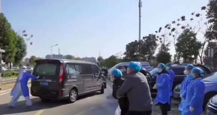 2月18日下午,在同濟醫院中法院區外,運送劉智明遺體的車輛緩緩駛離,妻子蔡利萍追着殯儀車失聲痛哭。幾名身穿藍色防護服的醫護人員在車旁難掩悲痛。