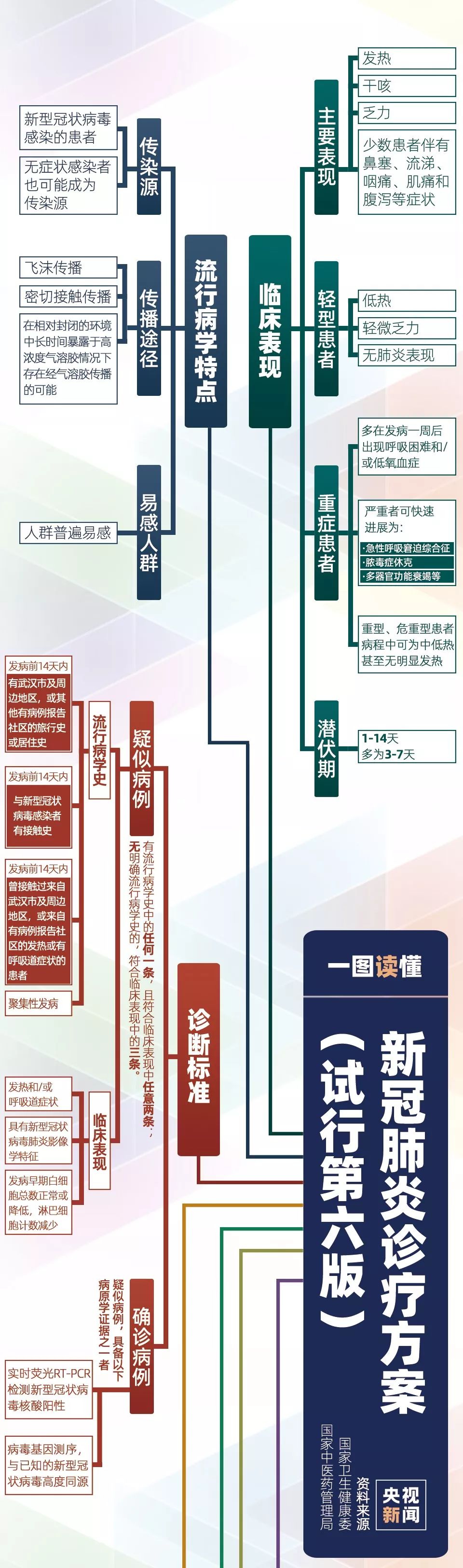 第六版診療方案中有關新冠肺炎傳播途徑、流行病學特徵、診斷標準、治療、出院後注意事項等要點,通過一張圖瞭解一下↓↓↓