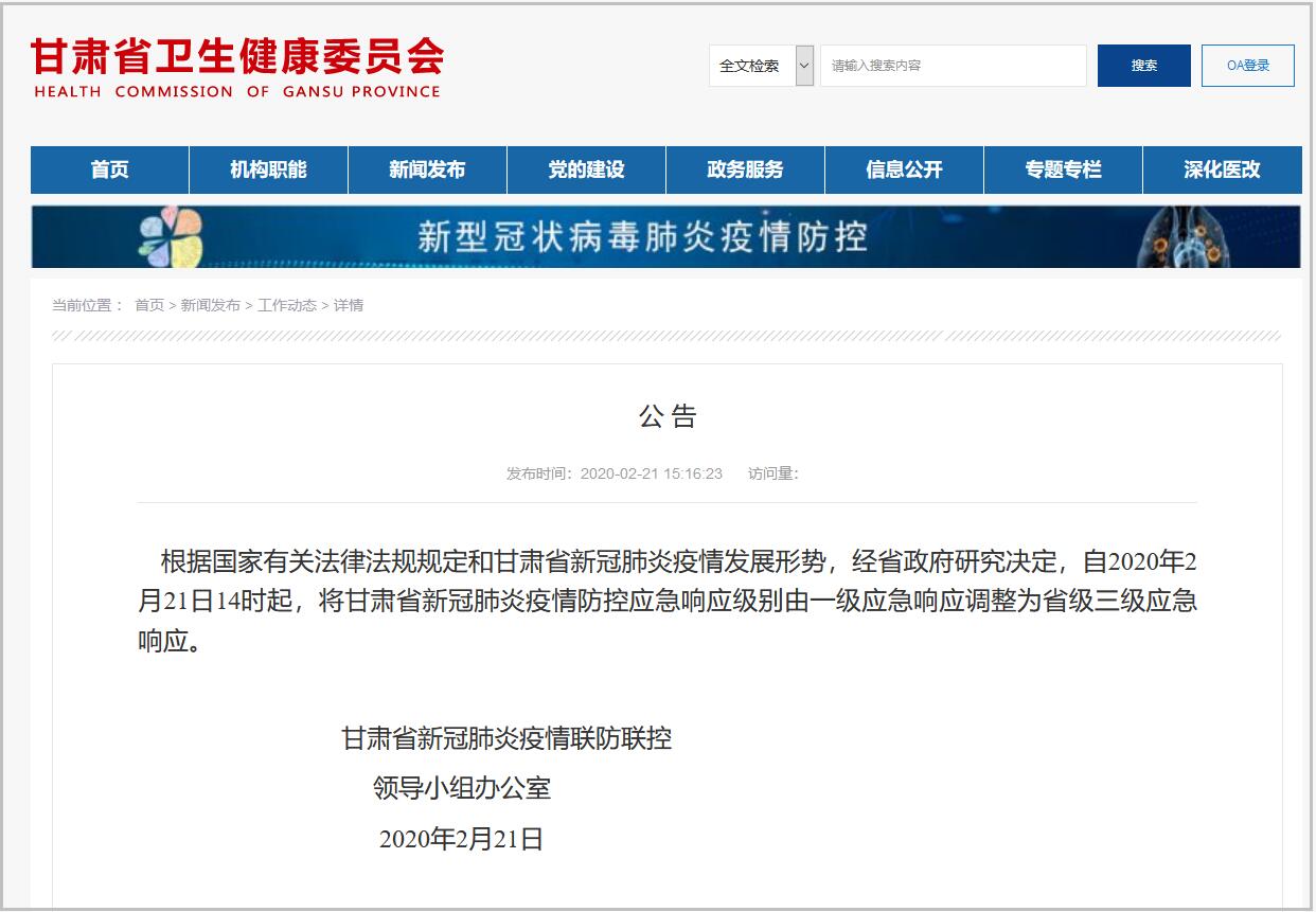 據甘肅省衞生健康委網站2月21日消息,甘肅省新冠肺炎疫情聯防聯控領導小組辦公室當天發佈公告稱,根據國家有關法律法規規定和甘肅省新冠肺炎疫情發展形勢,經省政府研究決定,自2020年2月21日14時起,將甘肅省新冠肺炎疫情防控應急響應級別由一級應急響應調整為省級三級應急響應。