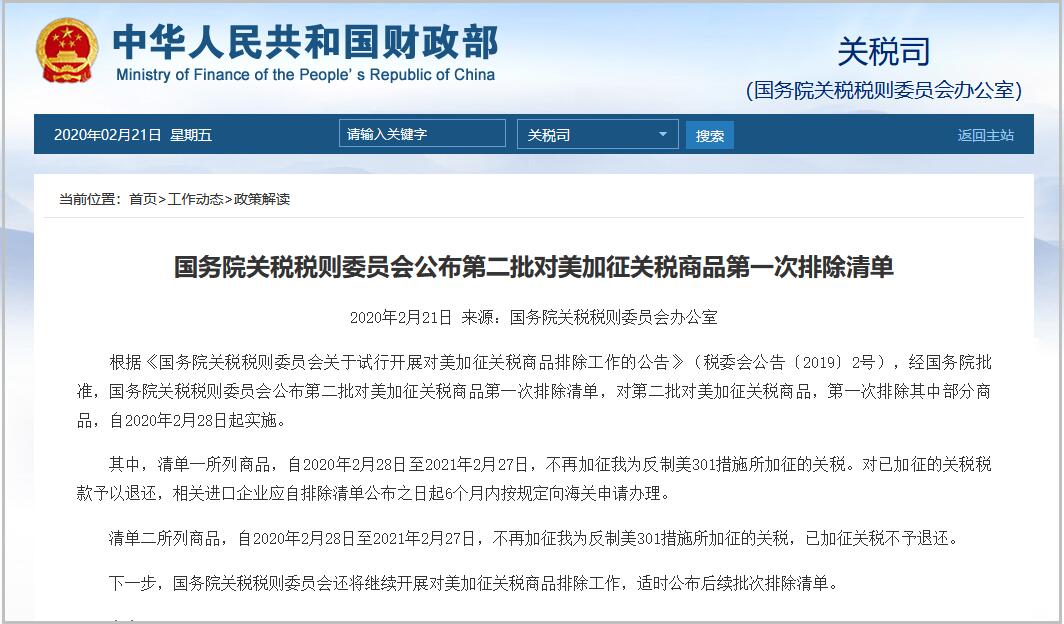 據財政部網站2月21日消息,根據《國務院關税税則委員會關於試行開展對美加徵關税商品排除工作的公告》(税委會公告〔2019〕2號),經國務院批准,國務院關税税則委員會公佈第二批對美加徵關税商品第一次排除清單,對第二批對美加徵關税商品,第一次排除其中部分商品,自2020年2月28日起實施。