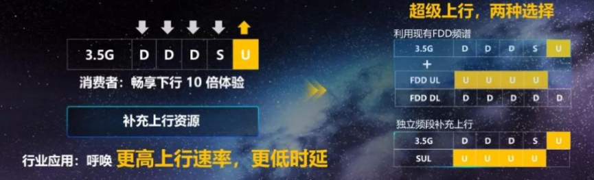 隨着上行大帶寬、低時延的需求如4K/8K直播等將不斷湧現,華為率先提出超級上行。該解決方案既可通過TDD和FDD頻譜協同,提升上行能力、降低時延,還可以使TDD系統配合全上行頻段,全面提升上行能力。
