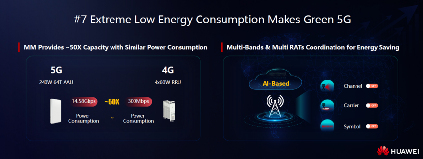 華為“軟硬”兼施:硬件不斷進步,5G模塊相比4G容量提升50倍同時,已做到能耗相當;同時軟件AI增強,在保障網絡KPI的同時,通過制式、通道、載波的AI智能關斷,實現精細、精準的全網級節能。