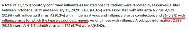 “從2019年10月1日到2020年2月15日期間,FluSurv-NET(流感住院監測網絡)站點共報告了13775例實驗室確認的流感相關住院病例;與甲型流感相關的有9168例(66.6%),與乙型流感相關的有4529例(32.9%),甲型流感和乙型流感共同感染的有42例(0.3%),被類型尚未確定的流感病毒感染的有36例(0.3%)。在確定了甲型流感亞型信息的人中,2385例(93.3%)是甲型H1N1 pdm09流感,172例(6.7%)是甲型H3N2流感。”