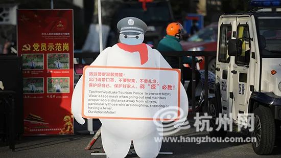 在斷橋入口處,有一個憨態可掬大白形象的“小警員”,上面寫着“出門請戴好口罩,不要聚集,不要扎堆。”