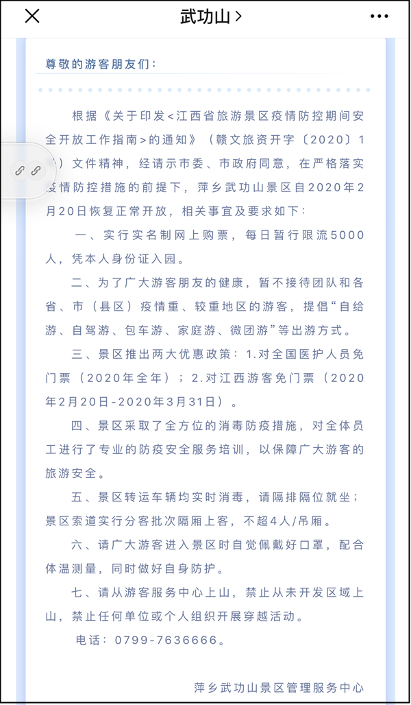 此外,景區還推出了兩大優惠政策,一是對全國醫護人員免門票(2020年全年),二是對江西遊客免門票(2020年2月20日—3月31日)。