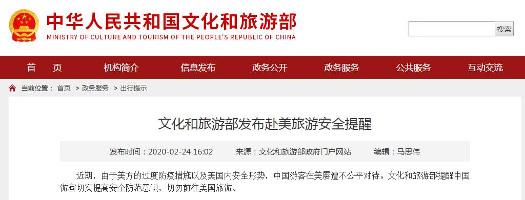 因美方過度防疫措施及安全形勢,文旅部提醒切勿前往美國旅遊 None 2020-02-24 據文旅部2月24日消息,文化和旅遊部發布赴美旅遊安全提醒稱,近期,由於美方的過度防疫措施以及美國內安全形勢,中國遊客在美屢遭不公平對待。文化和旅遊部提醒中國遊客切實提高安全防範意識,切勿前往美國旅遊。