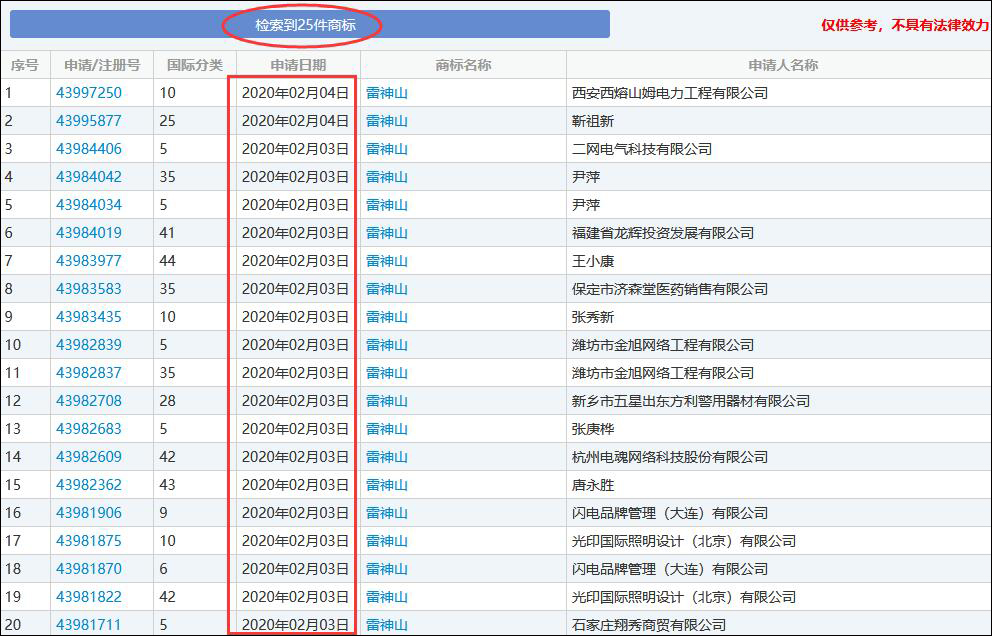 註冊了“雷神山”商標的有20多家企業或個人,涉及服裝、醫療器械、法律服務、科學技術服務等多個類別。