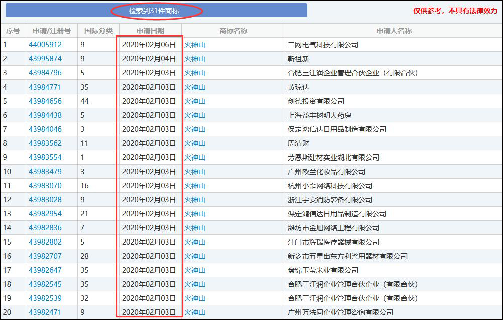 今天(25日)上午,觀察者網查詢國家知識產權局商標局的官網發現,有近30家企業或個人註冊了“火神山”商標,涉及化學工業品、藥物、遊戲器具和玩具、廣告、印刷品等多個品類。