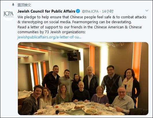 24日,猶太人公共事務委員會的官方推特,已將這篇聯名信置頂,並放上一張猶太人前往中餐廳用餐,與華人並肩站在一起的照片,以示支持。