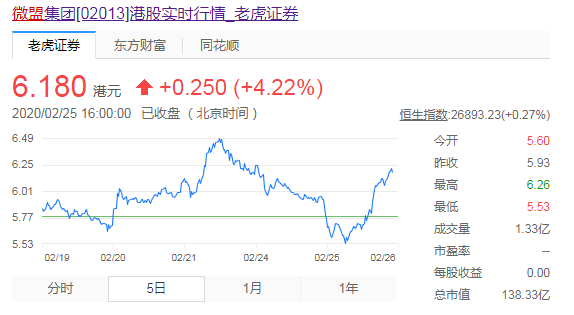 從2月24日至2月25日員工惡意破壞事件的一天時間內,微盟集團市值約蒸發了約9.63億港元。不過截至今日收盤,微盟收漲4.22%,報6.18港元/股,已回到24日下跌前的水平。
