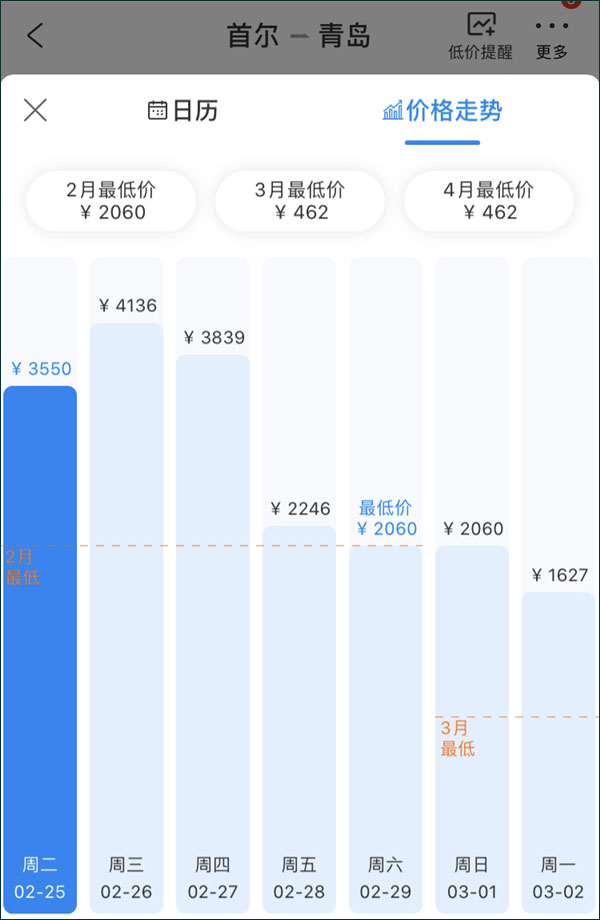 3月4日“首爾飛青島”機票價格變動情況(圖源:飛豬旅行)