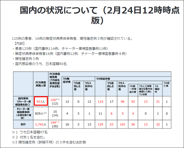 與前一日中午對比,當時日本在全國範圍對913人進行檢測(不含郵輪、包機人員),確診數為126人。