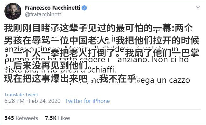 【文/觀察者網 嚴珊珊】2月24日,意大利知名歌手、製作人Francesco Facchinetti (弗朗西斯科·法奇內蒂)在社交媒體上稱,他親眼目睹一位“中國老人”因新冠病毒受到歧視並遭當地青年毆打的可怕場面,弗朗西斯科表示,他當時制止未果後,怒扇了青年倆巴掌。