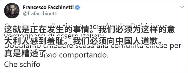 25日,弗朗西斯科在推特轉發了網友拍攝的現場視頻並寫道,“我們必須為這樣的意大利人感到羞恥。我們必須向中國人道歉。”