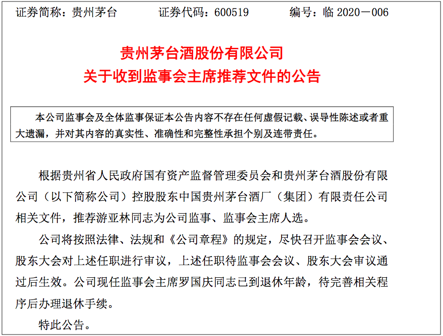 在上述背景下,當日,貴州茅台再發公告表示,根據貴州省人民政府國有資產監督管理委員會和貴州茅台酒控股股東茅台集團相關文件,推薦遊亞林同志為該公司監事、監事會主席人選。現任監事會主席羅國慶同志已到退休年齡,待完善相關程序後辦理退休手續。