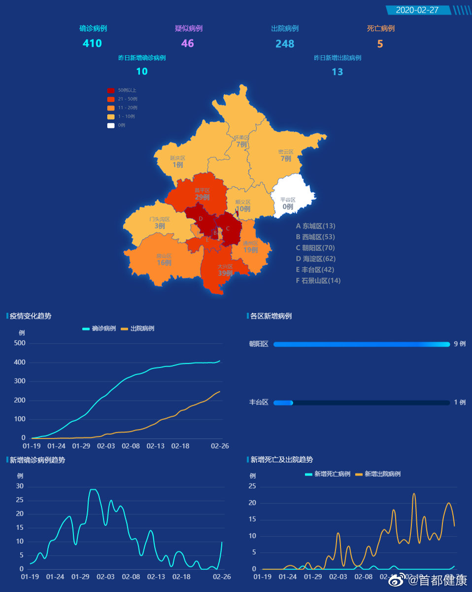 截至2月26日24時,北京市累計確診病例410例,出院248例,死亡5例。確診病例中東城區13例、西城區53例、朝陽區70例、海淀區62例、豐台區42例、石景山區14例、門頭溝區3例、房山區16例、通州區19例、順義區10例、昌平區29例、大興區39例、懷柔區7例、密雲區7例、延慶區1例,外地來京人員25例。平谷區尚未有病例。