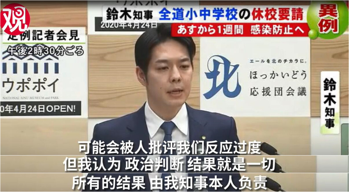 就外界可能出現的“停課是反應過度”的批評,鈴木直道直言,“(日本)因疫情停課一事並無先例”,但自己基於政治判斷做出以上決定,“一切後果將由本人負責”。