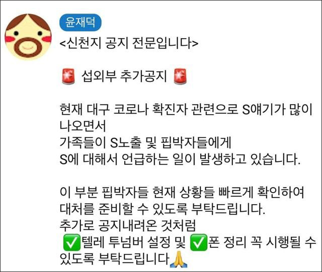 韓國社交媒體上也有人泄露,疑似“新天地”高層在疫情爆發之際給信徒下指示,要求刪除手機中的內容,隱瞞信徒身份。