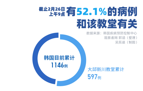 據韓國疾病預防控制中心(KCDC)數據,截至26日上午9點,韓國累積確診1146例,11例死亡。其中597例為去過大邱新川教堂的“新天地”信徒,佔比52.1%。