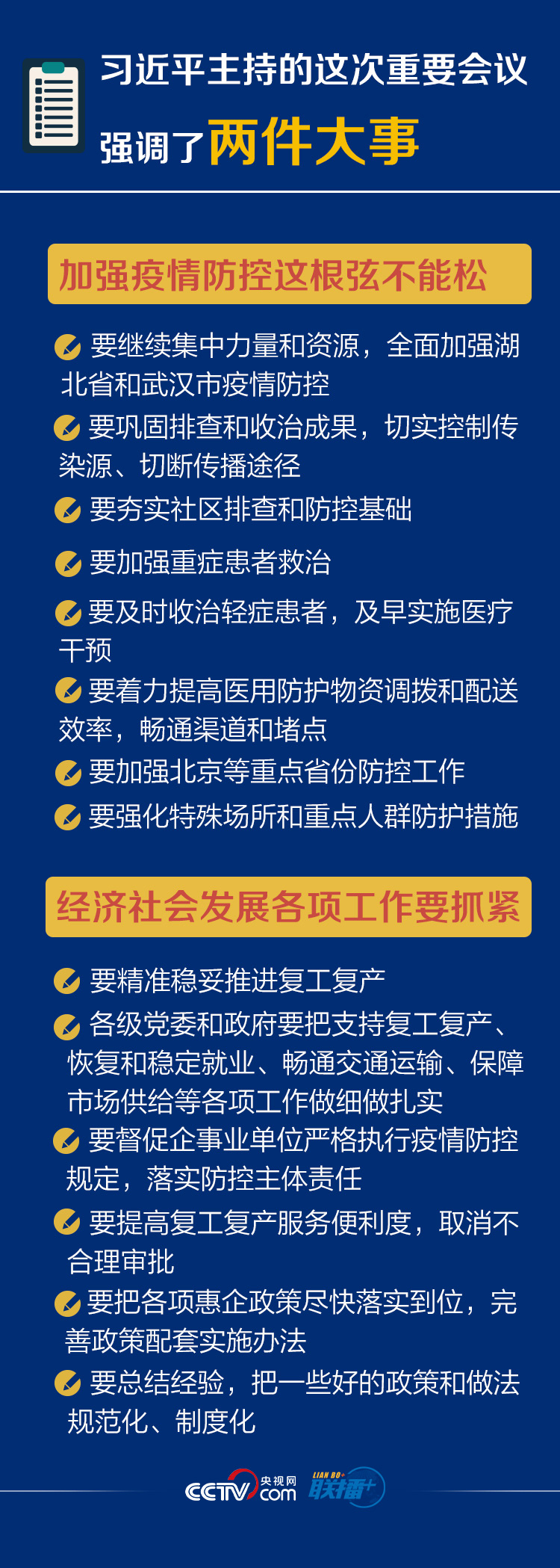 千磨萬擊還堅勁,越是艱險越向前。不獲全勝決不輕言成功。在此關鍵時刻,本次會議圍繞“加強疫情防控”和“經濟社會發展”兩件大事作出了具體部署,《聯播+》特梳理,與您共同學習。
