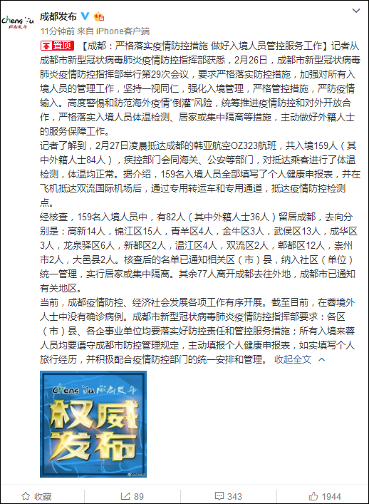 記者瞭解到,2月27日凌晨抵達成都的韓亞航空OZ323航班,共入境159人(其中外籍人士84人),疾控部門會同海關、公安等部門,對抵達乘客進行了體温檢測,體温均正常。據介紹,159名入境人員全部填寫了個人健康申報表,並在飛機抵達雙流國際機場後,通過專用轉運車和專用通道,抵達疫情防控檢測點。