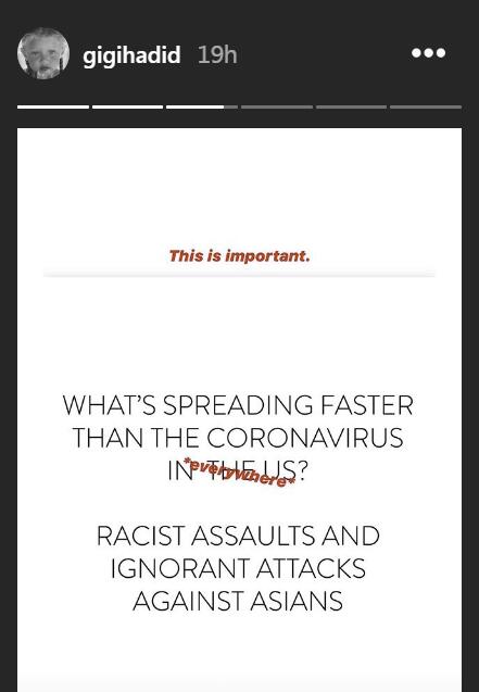此外,Gigi還轉發了著名美籍亞裔時裝設計師Prabal Gurung(普拉巴·高隆)的Ins圖片,上面寫道“比新冠病毒傳播更快的,是對亞洲人的種族歧視和愚昧攻擊”。