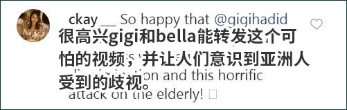 對此,2月26日,曾深陷“種族歧視”風波的美國超模Gigi Hadid(吉吉·哈迪德),與其妹妹Bella Hadid(貝拉·哈迪德)分別在社交媒體為受欺負的老人發聲,呼籲不要種族歧視,並寫道“比新冠病毒傳播更快的,是對亞洲人的種族歧視和愚昧攻擊”。