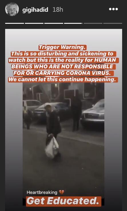 視頻發佈後,不少網友對此感到憤怒。2月26日,當紅美國模特、前維密大秀超模Gigi Hadid(吉吉·哈迪德)在Instagram story中連發兩圖為亞裔老人發聲。她轉發了這段視頻並寫道,“這視頻看得太令人不安和噁心了,但卻真實發生在那些與新冠病毒無關或者沒有感染病毒的人身上。我們不能讓這種事再繼續發生了。”
