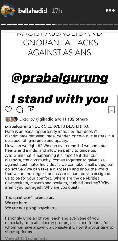 在Bella轉發的圖片中,成長於尼泊爾的著名美籍設計師Prabal Gurung寫道,“沉默是毀滅性的”,不論種族、性別還是膚色,仇恨都會在無知和冷漠中潰爛,我們需要敞開心扉,並且讓同情心引導我們,才能一起克服這種仇恨。