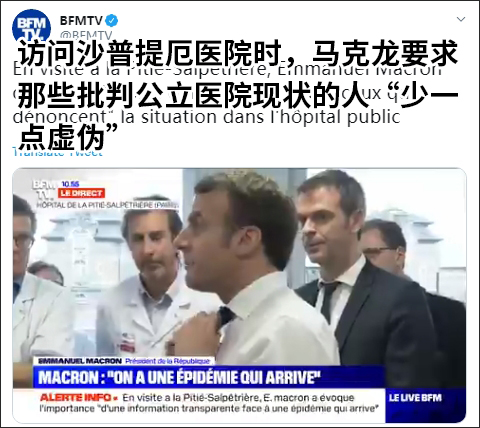 在醫院現場,有醫生當面向馬克龍呼籲,增加對公立醫院的投入。他本人則回應,希望對公立醫院境況不滿的人“少一點虛偽”。