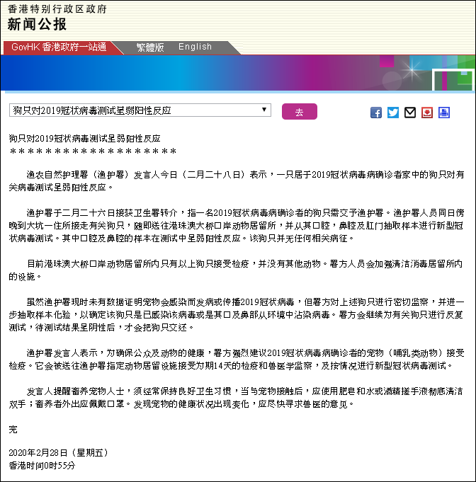 (觀察者網訊)香港特區政府2月28日發佈新聞公報,稱特區政府漁農自然護理署(漁護署)發言人今日(二月二十八日)表示,一隻居於2019冠狀病毒病確診者家中的狗只對有關病毒測試呈弱陽性反應。