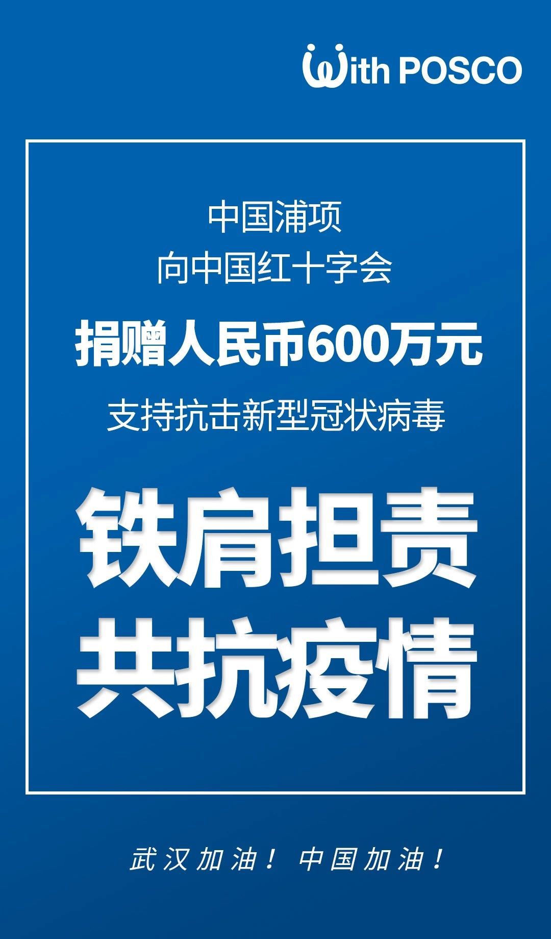 浦項捐贈600萬元現金支援疫情防控。其中300萬元由浦項韓國總公司通過韓國紅十字會捐贈,300萬元由浦項中國等21家在華分公司通過中國紅十字會捐贈。