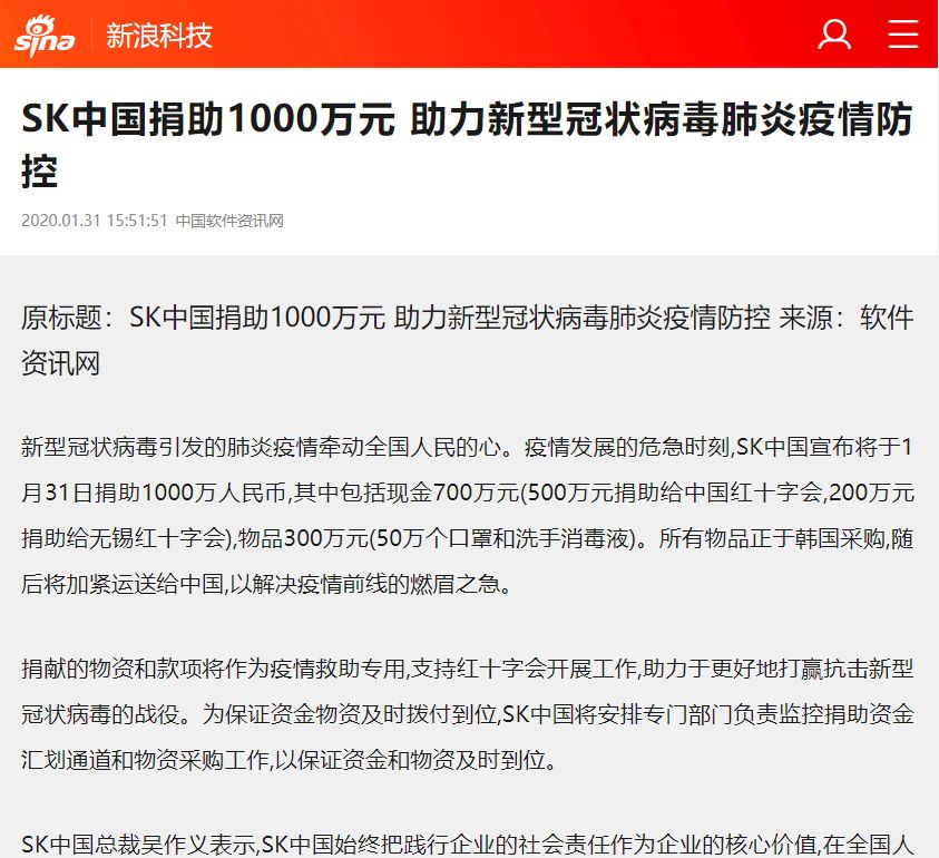 SK中國捐贈700萬元現金及300萬元物資支持疫情防控。現金部分,500萬元現金將捐助給中國紅十字會,200萬元現金捐助給無錫紅十字會。300萬元醫用物資包含40萬個口罩和洗手消毒液,正於韓國採購,將加急運送至中國。同時,SK綜合化學捐贈100萬元現金,用於支持全國新型冠狀病毒感染的肺炎疫情防控工作;SK E&S正在積極籌備20萬個口罩,緩解疫情嚴重地區物資緊缺局面。