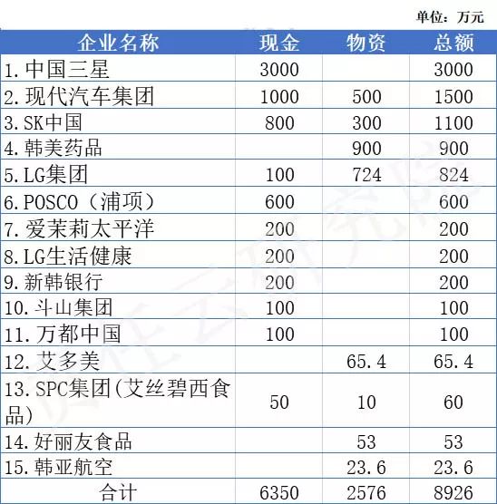 附表:韓國企業捐贈金額統計(截至2月1日)