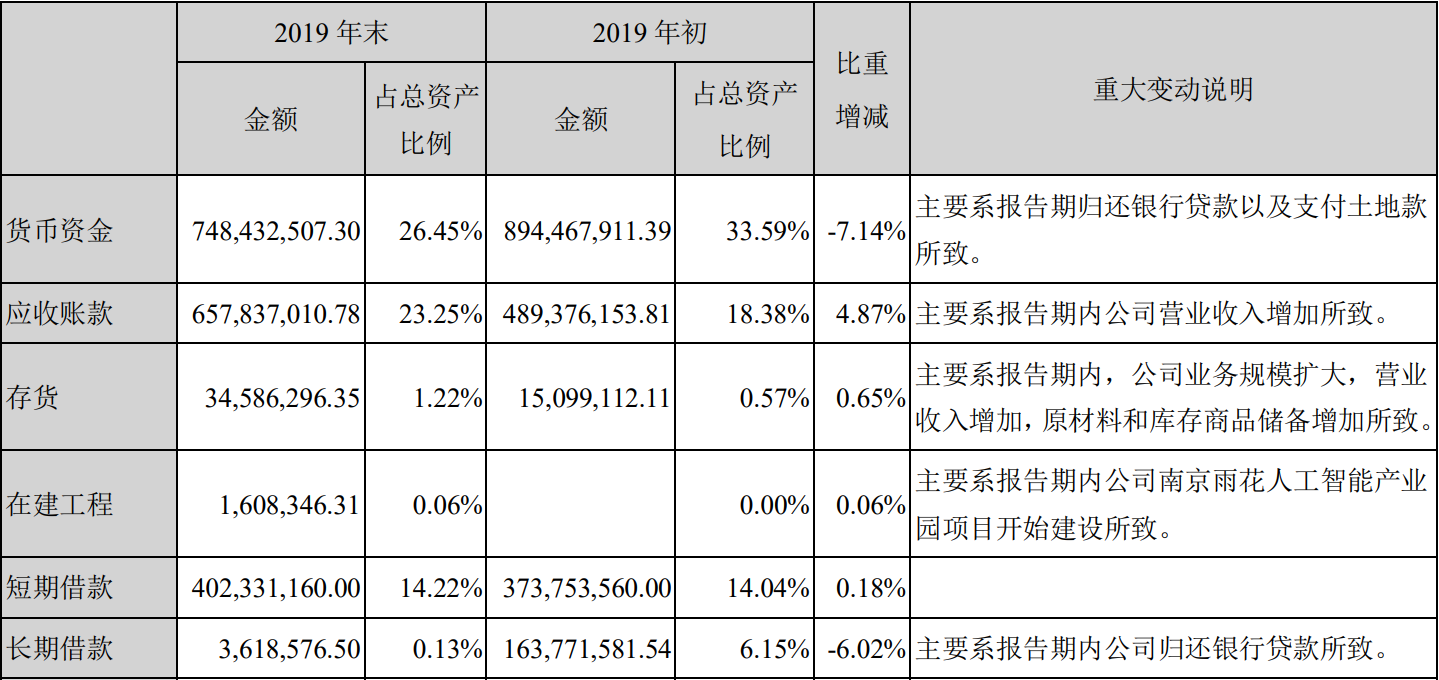 另外,在支付利息費用的同時,其期末貨幣資金超過7.48億元,佔總資產比重最高,為26.45%,但較2019年初下降1.46億元。