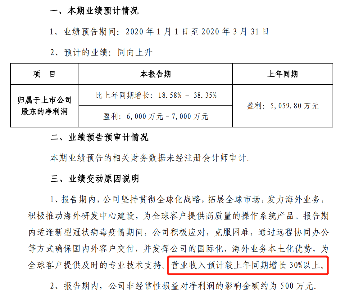 值得一提的是,與年報同時發佈的還有中科創達2020年一季度預告。該公司預計,本季度營收同比增速將超過30%;歸屬於上市公司股東的淨利潤6000-7000萬元,同比增長18.58%-38.35%。