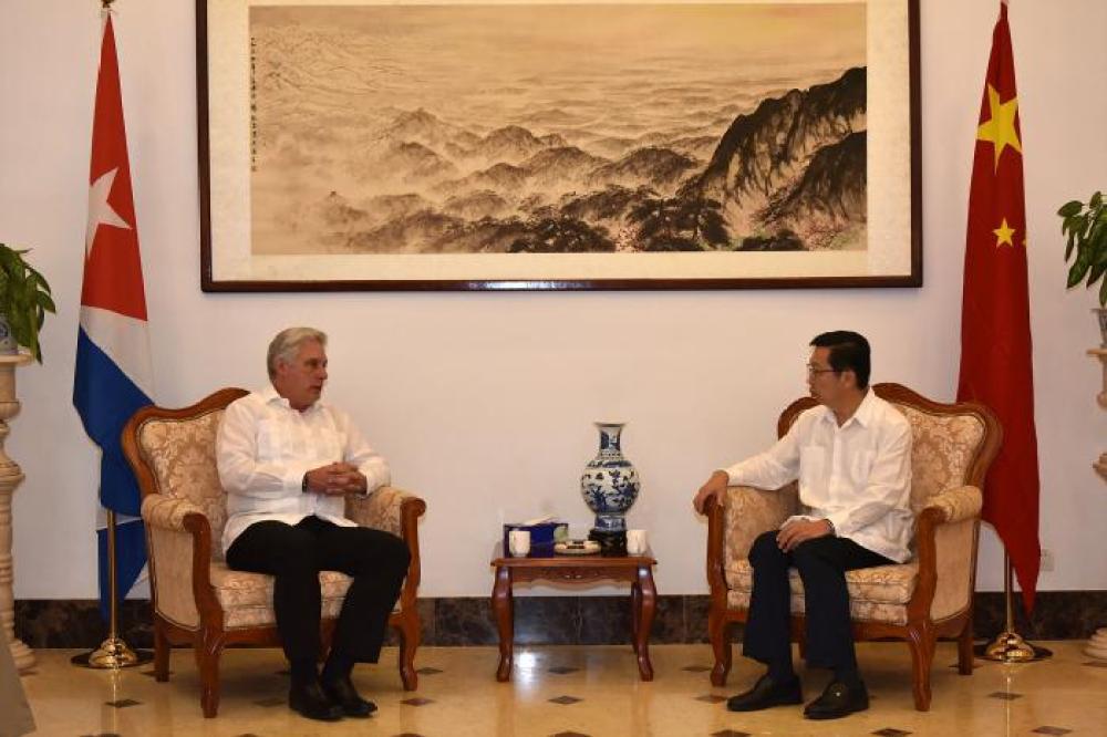 古巴國家主席迪亞斯 - 卡內爾(左)到中國駐古巴使館對我抗擊新冠肺炎疫情表達慰問和支持。圖片來源:中國駐古巴使館官方網站