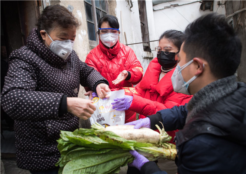 武漢市西城壕社區網格員黃麗芳(左二)與志願者柳瑩(右二)、張琦(右一)為空巢老人送菜(2月7日攝)。新華社記者肖藝九攝