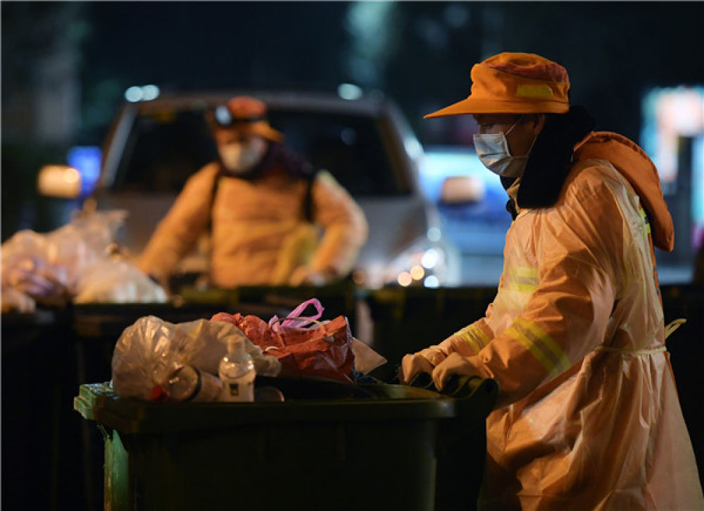 江岸環衞集團工作人員在武漢街頭清運社區生活垃圾(2月1日攝)。新華社記者 李賀 攝