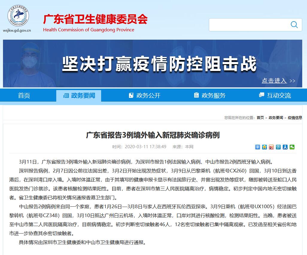 據廣東省衞生健康委消息,3月11日,廣東省報告3例境外輸入新冠肺炎確診病例,為深圳市報告1例法國輸入病例、中山市報告2例西班牙輸入病例。