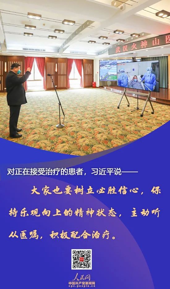 ● 全國人民都在關心關注着你們。醫務人員要竭盡所能為大家提供治療,各方面要關心被感染的羣眾,照顧好他們的家人,讓患者安心接受治療。