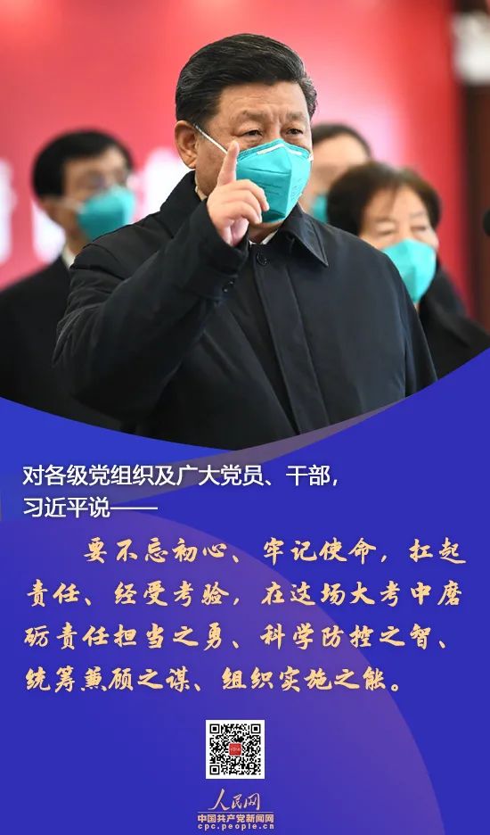 ● 各級黨組織和廣大黨員、幹部要不忘初心、牢記使命,扛起責任、經受考驗,在這場大考中磨礪責任擔當之勇、科學防控之智、統籌兼顧之謀、組織實施之能,做到守土有責、守土有方。