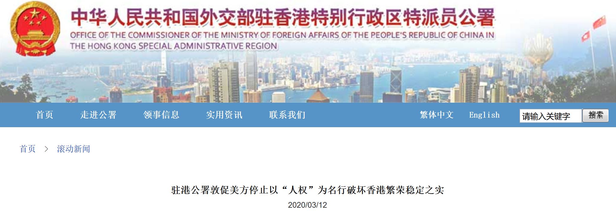 針對美國國務院發表含涉港內容的“2019年度國別人權報告”,外交部駐港公署網站3月12日發佈表態《駐港公署敦促美方停止以“人權”為名行破壞香港繁榮穩定之實》。