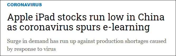 (文/觀察者網 朱紫薇)3月11日,據日經新聞報道,受疫情影響,不少學校相繼宣佈停課,許多家庭搶購平板電腦,導致需求激增。再加之這期間生產短缺,進一步促使蘋果iPad在華庫存吃緊。